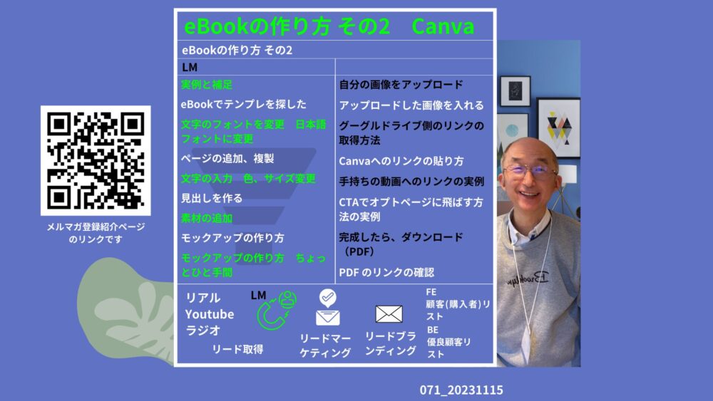 さて、 今回は、071_eBookの作り方 その2 canva です。 インデイです。 E-Bookの作り方 その2 こんにちは、今日は「E-BOOKの作り方 その2」についてお話しします。 補足事項とリンク […]