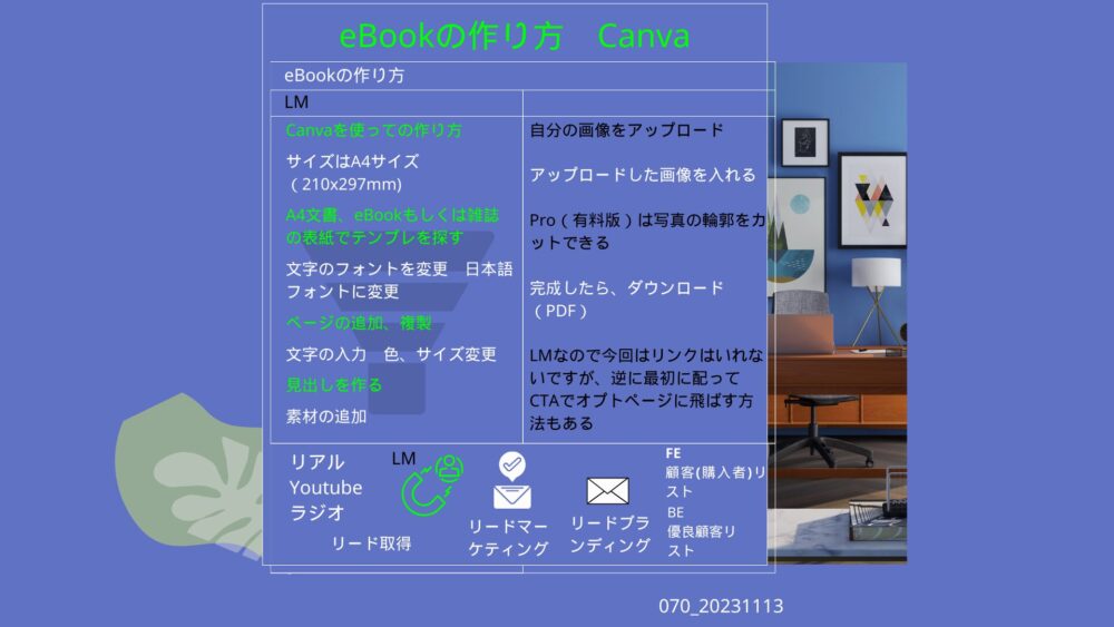 さて、 今回は、070_ebookの作り方 canva です。 インデイです。 今回は、初心者向けに作りやすいリードマグネットのひとつであるeBookの作り方です。A4の縦サイズを例にしていますが […]